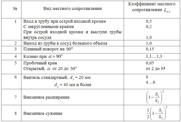 Коэффициент ξ показывает количество скоростного напора, затрачиваемого на преодоление какого-либо местного сопротивления. Он зависит от формы компонента, его размера, шероховатости и режима движения (числа Рейнольдса). Наиболее часто встречающиеся коэффициенты местных сопротивлений приводятся в справочниках, определяются экспериментально или рассчитываются.