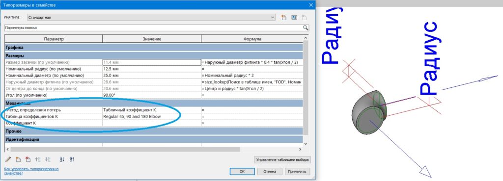 * Необходимо отметить, что Коэффициент К для соединительных деталей трубопроводов является встроенным параметром типа. Если фитинги в семействе подбираются таблицами поиска в зависимости от диаметра и угла поворота, то необходимо изменить его на параметр экземпляра и задать разные значения для разных типоразмеров. Задайте любое значение параметру Коэффициент К в семействе. Замените категорию семейства на Обобщенную модель и измените параметр Коэффициент К на параметр экземпляра. Загрузите таблицу поиска и пропишите ее в разделе Формулы. Поменяйте категорию семейства обратно на Соединительные детали трубопроводов.