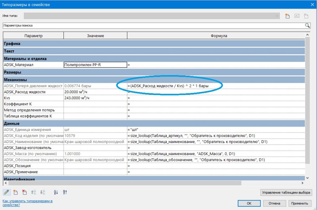 В Revit потери давления с помощью параметра Kvs назначаются через формулу.