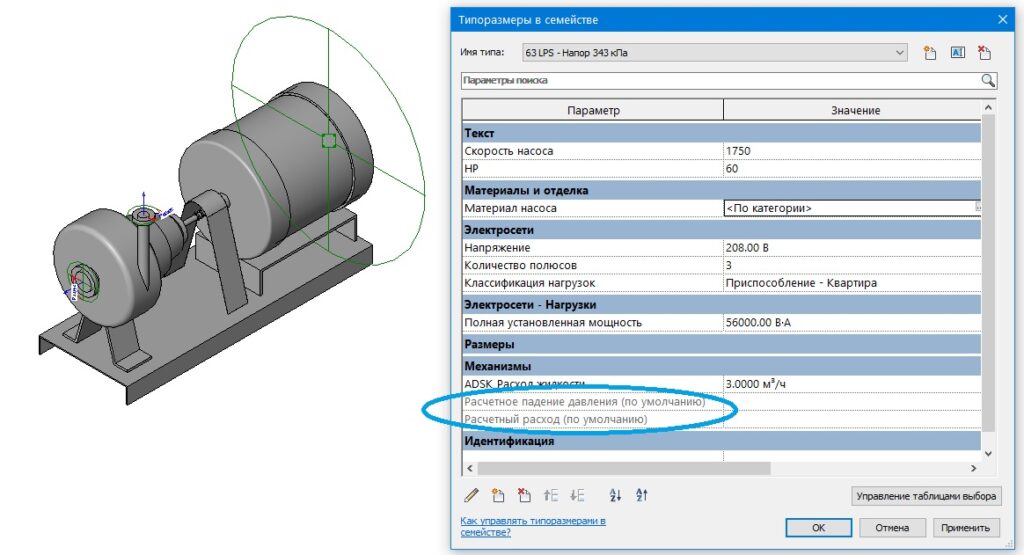 В Revit насосы имеют два встроенных параметра: «Расчетный расход» и «Расчетное падение давления».